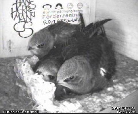 Fig. 3 Poster showing examples of how to become a “Swift Expert” in the school of special education We also drew attention to the fact that Swifts do not soil house walls, are not noisy and do not damage or harm anything or anybody. The students watched documentary films about Swifts, did their own research on the internet under professional supervision and wrote short, imaginative stories. They also wrote letters to the municipality and architects asking them to delay the construction work until the birds were gone. The children also created big placards about Swifts and their habits. These were shown in the lobby of the school to inform other pupils and visitors about the birds. Result: The various efforts of the children and their teachers succeeded in postponing the construction work near the nesting places until the birds had finished breeding. Fig. 4 Swifts made of wool by the students 2. Building new nesting places The students created swift mobiles, crafted swifts out of clay, sang a “swift song” which they had composed and sold their arts and crafts. Through these activities they collected money to buy new nesting boxes. Through newspaper articles about these events, many people, including the municipality, became aware of this project and were encouraged to donate money too. The imaginative stories, which the pupils wrote in their German lessons, were very popular and motivated the children to do even better. Most of these stories were published on the school’s webpage. Result: The old nesting places in the shutter boxes of the windows could be replaced by new nesting boxes which were hung up on the school building. Swifts were attracted with the use of a “swift calls” tape and moved into all the new boxes. Our efforts paid off and were well worth it. Fig. 5 A still of “our” Swift parents, Martinet and Herrmann, in the special Webcam - nesting box 3. Sustaining the motivation of the children to protect the environment and building up a bigger community of friends for the Swift This was most important in the ensuing years. In the year 2003/2004 we installed two web-cams into a two-chamber nesting box and broadcast the birds breeding live on a monitor in the school lobby and on the internet (www.mauerseglerschule.de). The broadcast was used in class as a basis for writing observation papers, using the correct scientific language, and for inspiring ideas for new make-believe stories. We found that pupils were watching the breeding on the monitor even in breaks when they were not under supervision or fulfilling specific tasks associated with observation of the birds. They also discussed the birds and their behaviour outside of class and we were very encouraged to see that they were so interested in nature. Results: The pupils had a lot of fun but were also seriously interested in observing the birds in their nesting places through involvement in preparing structured observation papers. They asked a lot of questions and developed different hypotheses based on their results. The feedback which the children received on their essays made them feel very proud and the teachers knew that they had fulfilled the requirements of the curriculum. Conclusion The Swift colony was saved and grew even bigger despite the running of construction works on all three of our school buildings. The students were so interested in the Swift as a protected species and as a class subject, that they were highly motivated to fulfil their tasks in class and worked with the greatest of ease. The teachers capitalised on the natural interest of their pupils to develop a variety of assignments in different streams of the curriculum. They were very pleased to find that, along the way, the pupils learnt a great deal about their town, the organisation of the municipality and how public opinion is shaped. The families of the children and lots of other people became infected with “Swift fever” and hung up nest boxes on their own houses to attract the birds and then spent time watching them. The Head of the school received a number of prizes from the town for the school’s efforts in support of bird protection and the development of a mixed programme approach to the teaching of nature. For the same reason the author was awarded the title of “Green Angel” by the Bavarian Environment Minister, in 2010 at Nuremberg, Bavaria. This prize is awarded by the Bavarian State Ministry of Environment and Health each year to a maximum of 50 people. Acknowledgement I am grateful to Mandy Mayer, London for helping me with the English text. References Lehrplan für die bayerische Grundschule, genehmigt mit Bekanntmachung des Bayerischen Staatsministeriums für Unterricht und Kultus vom 9. August 2000, Nr. IV/ 1-S 7410/ 1-4/ 84000 © APUSlife 2011, No. 4842 Simultaneously published and printed 2011 in Ecologia Urbana, special issue 2/2011 with papers from the Commonswift Seminars Berlin 2010 ISSN 1438-2261 [1] Elementary school, high school and schools for special education.